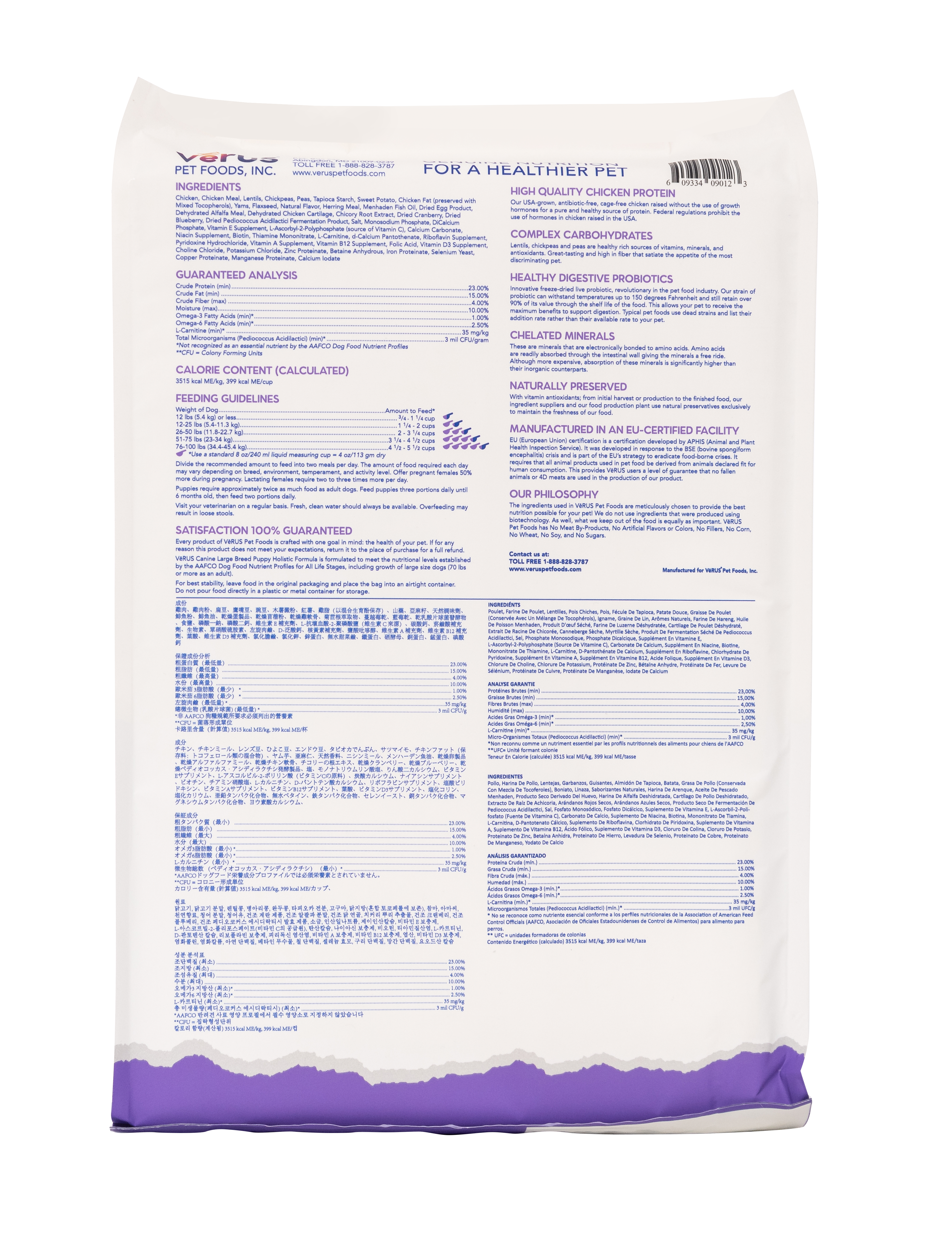 VēRUS Large Breed Puppy Chicken, Lentils & Yams Holistic Formula is a unique combination of fresh meats, vegetables and legumes. It is designed for dogs up to 20 months old and 70 pounds or more at maturity.