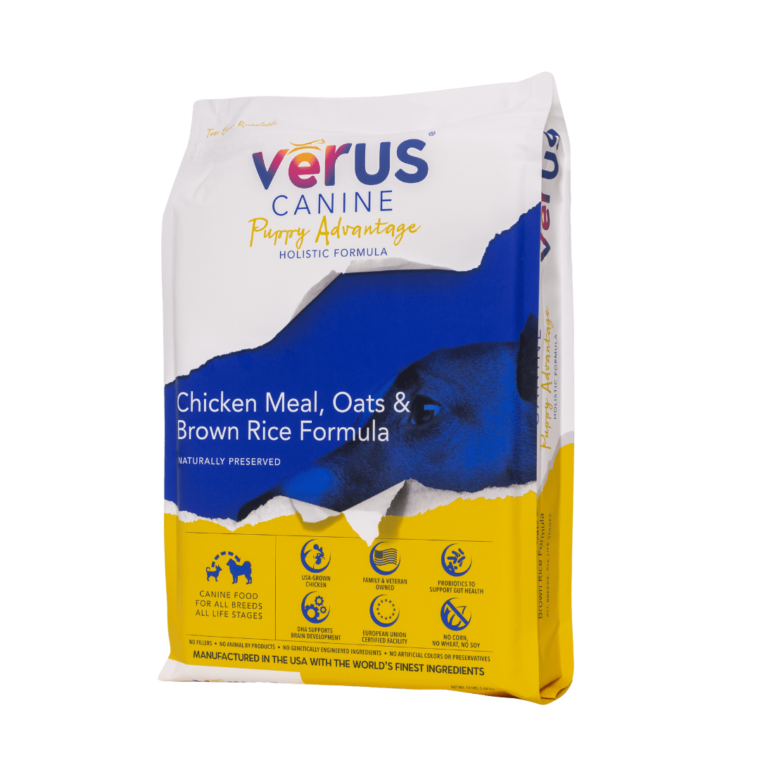 VēRUS Puppy Advantage Chicken Meal, Oats & Brown Rice Holistic Formula is designed for small and medium breed puppies whose weight is 70 lbs or less at maturity.